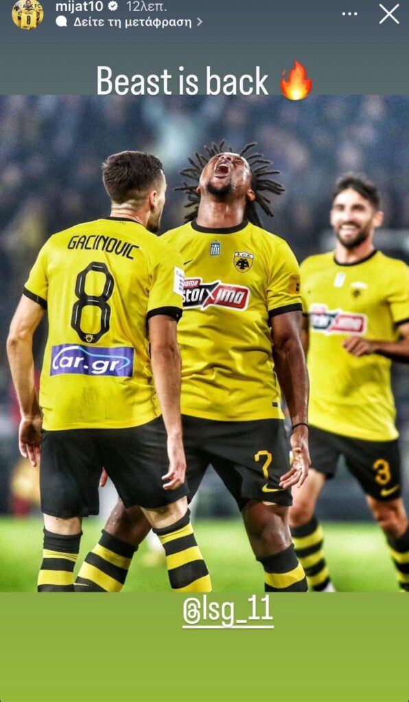 Ο επιθετικός της ΑΕΚ το πανηγύρισε έξαλλα, μαζί με τους συμπαίκτες του που χάρηκαν που τον είδαν να επιστρέφει στα γκολ. Ο Μιγιάτ Γκατσίνοβιτς μάλιστα, έκανε ανάρτηση για τον συμπαίκτη του, στον λογαριασμό που διατηρεί στο Instagram.