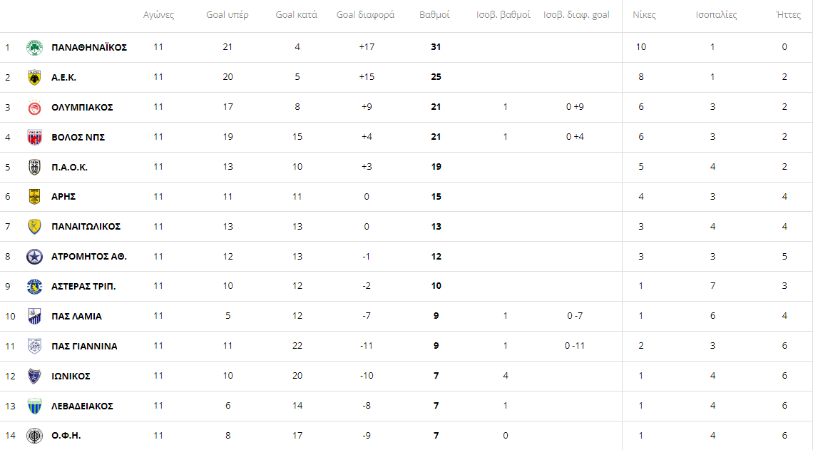 Παναθηναϊκός και Ολυμπιακός έμειναν ισόπαλοι με 1-1, στο μεγάλο ντέρμπι της αγωνιστικής. Την γκέλα των «Πράσινων» δεν κατάφερε να εκμεταλλευτεί η ΑΕΚ, ώστε να πλησιάσει στην κορυφή, καθώς γκέλαρε εκτός έδρας με τον Αστέρα Τρίπολης (1-1). Η μοναδική ομάδα από την πρώτη εξάδα που κέρδισε ήταν ο ΠΑΟΚ, ο οποίος το Σάββατο επικράτησε εντός έδρας του ΠΑΣ Γιάννινα με 2-0. Αναλυτικά η βαθμολογία της Super League μετά από έντεκα αγωνιστικές.