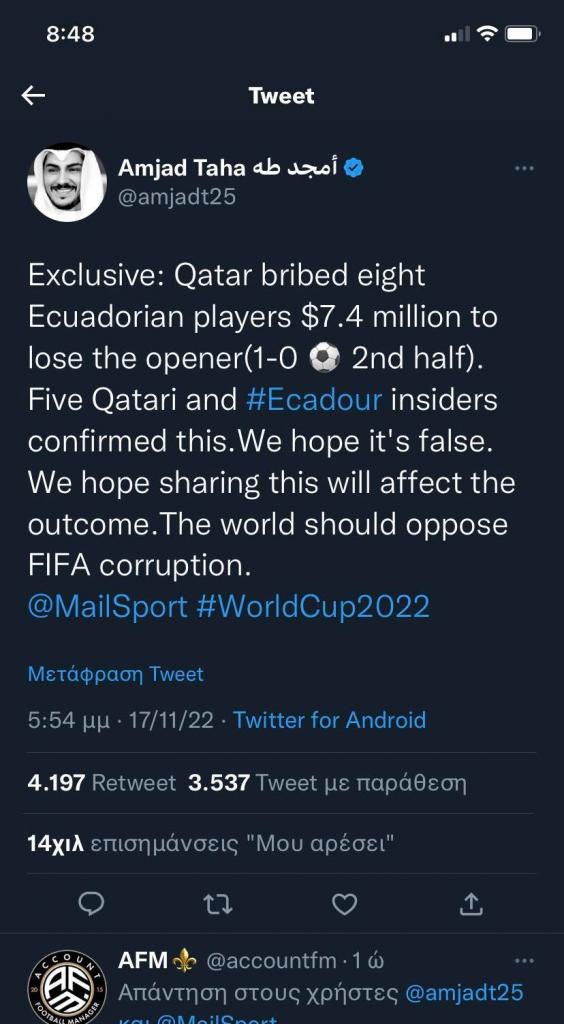 Ο Αμτζάντ Ταχά έκανε λόγο πως το παιχνίδι του Κατάρ με το Εκουαδόρ είναι στημένο για να κερδίσει ο γηπεδούχος με 1-0, με γκολ στο δεύτερο μέρος. Mάλιστα όπως γίνεται γνωστό το Κατάρ έχει πληρώσει 7.4 εκατομμύρια δολλάρια για τη νίκη στο συγκεκριμένο παιχνίδι.