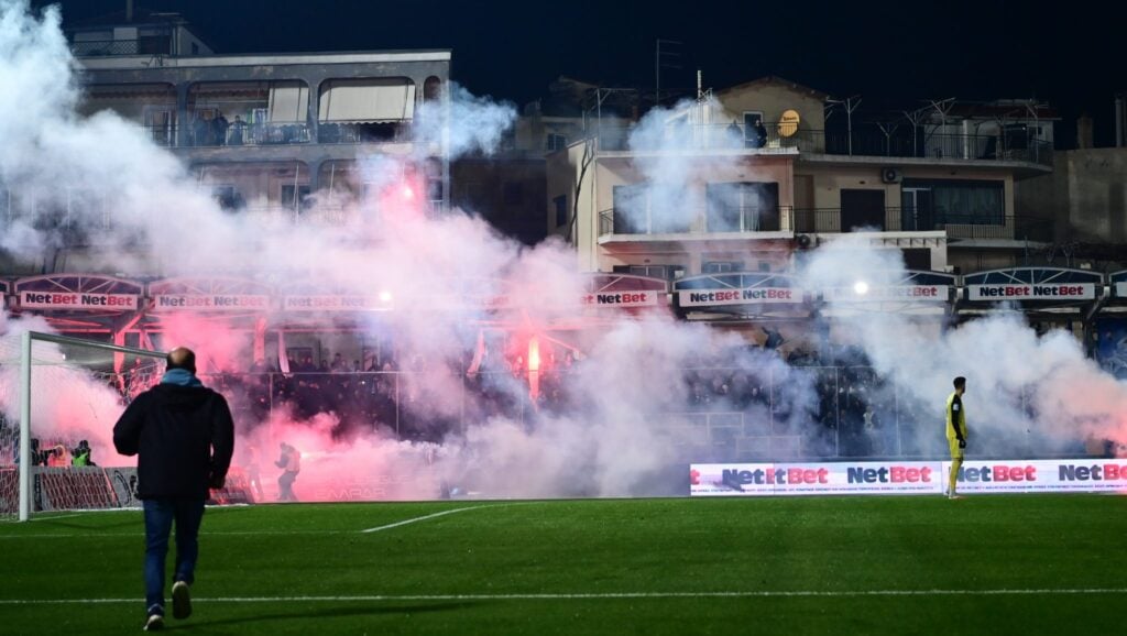 Κι αυτό γιατί μετά από συγκρούσεις οπαδών του ΠΑΣ Γιάννινα με δυνάμεις των ΜΑΤ, ο διαιτητής Κουμπαράκης αποφάσισε να αποσυρθούν οι δύο ομάδες στα αποδυτήρια μέχρι να ηρεμήσουν τα πνεύματα.