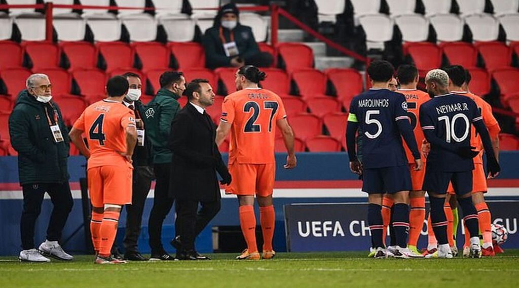 Η αναμέτρηση στο «Παρκ ντε Πρενς» ανάμεσα στην Παρί Σεν Ζερμέν και την Μπασάκσεχιρ για τον όγδοο όμιλο διακόπηκε, όταν ο τέταρτος διαιτητής Ρουμάνος Σεμπάστιαν Κολτέσκου, αποκάλεσε «νέγρο» τον assistant της Μπασάκ, Πιέρ Ουεμπό και στη συνέχεια τον απέβαλε. Ο Ντεμπά Μπα, ποδοσφαιριστής των φιλοξενούμενων, κάλεσε αμέσως τους συμπαίκτες του να αποχωρήσουν, κάτι στο οποίο συμφώνησαν και οι παίκτες της Παρί.