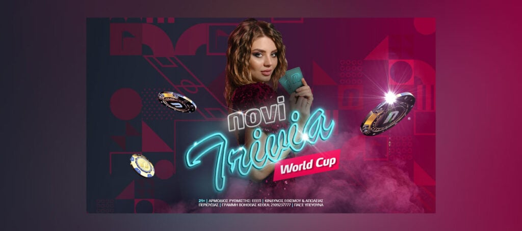 Το Novi Trivia Show είναι ένα ζωντανό παιχνίδι που εκπέμπεται από το live καζίνο, σε επιλεγμένες ημερομηνίες! Κατά τη διάρκεια του Μουντιάλ η εκπομπή θα ξεκινάει στις 23:30 καθημερινά και «7 στα 7».Το παιχνίδι δεν βασίζεται στην τύχη και δεν προϋποθέτει συμμετοχή στα παίγνια με αληθινά χρήματα.