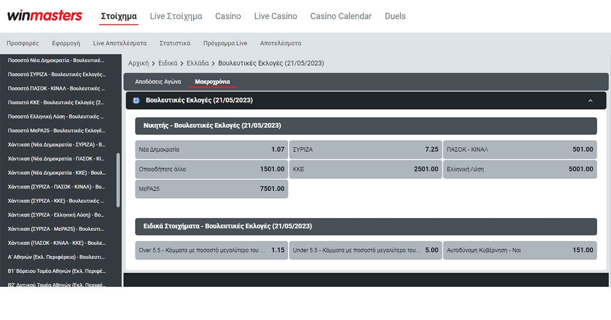 Με αυτές τις εκλογές να παρουσιάζουν και μεγάλο στοιχηματικό ενδιαφέρον, η winmasters έχει φτιάξει τη μεγαλύτερη γκάμα στοιχημάτων, με πολλαπλές επιλογές για Νικητή, Over/Under σε Ποσοστά Κομμάτων, Χάντικαπ (Διαφορά Ποσοστού) Κομμάτων, Ποσοστά Κομμάτων ανά Εκλογική Περιφέρεια και Νικητή (Πρώτο σε Ψήφους) ανά Κόμμα σε Εκλογική Περιφέρεια.