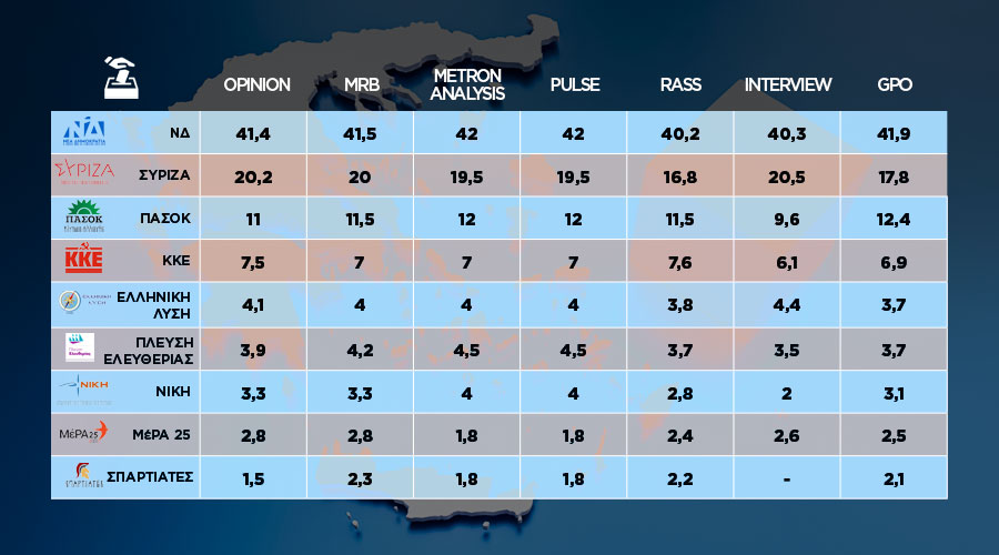 - Τα ποσοστά αφορούν τον μέσο όρο από την έρευνα των δημοσκοπικών εταιρειών, καθώς είναι σχεδόν αδύνατο να αποτυπωθεί το ακριβές ποσοστό κάθε κόμματος.
