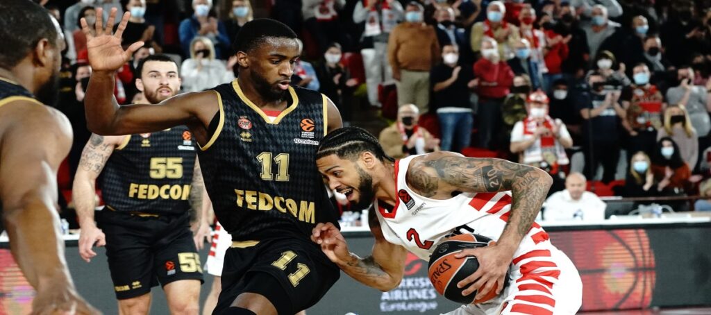 Ο Ολυμπιακός είχε επικρατήσει της Μονακό στο ΣΕΦ στις 5 Νοεμβρίου 2021, με σκορ 86-65. Πρώτος σκόρερ τότε για την ομάδα του Γιώργου Μπαρτζώκα ήταν ο Τάιλερ Ντόρσεϊ (18 π.) και ο Λιβιό Ζαν Σαρλ (18 π.). Για μία ακόμα φορά ο Σάσα Βεζένκοφ είχε κάνει double-double σε πόντους (10) και ριμπάουντ (10). Από πλευράς Μονακό, καλύτερος ήταν ο Ντόντα Χολ με 11 πόντους και 9 ριμπάουντ, ενώ ο Μάικ Τζέιμς έμεινε χαμηλά για τα δικά του δεδομένα, με μόλις 7 πόντους και 2/11 σουτ.