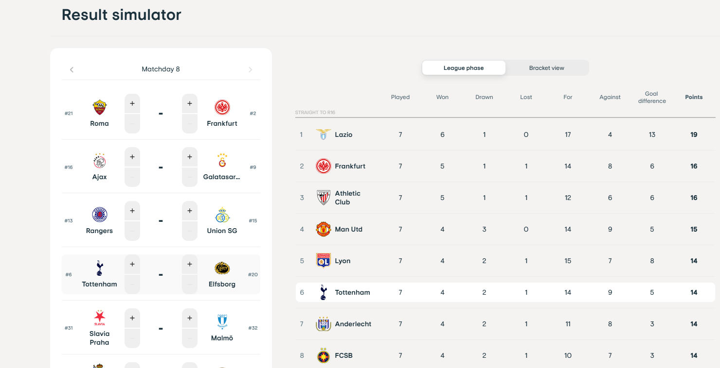 Εκτός από τα παραπάνω, η UEFA σας δίνει τη δυνατότητα να δοκιμάσετε στην πράξη μέσω του προσομοιωτή Γιουρόπα Λιγκ. Φτιάξτε τα σκορ των αγώνων και δείτε πώς διαμορφώνεται η τελική βαθμολογία ανάλογα με τα αποτελέσματα που επιλέξατε. Δείτε ποιες ομάδες μένουν έξω και ποιες προκρίνονται στην επόμενη φάση.
