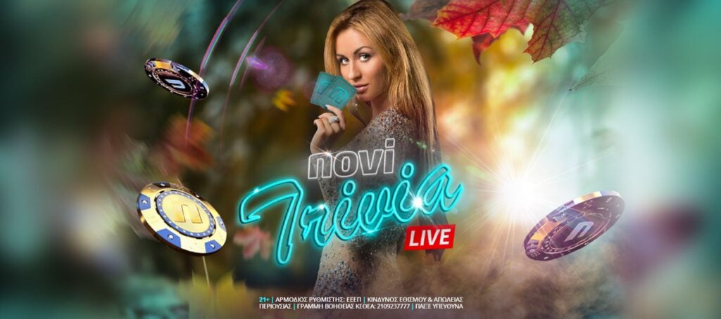 Το Novi Trivia Show είναι ένα ζωντανό παιχνίδι που εκπέμπεται από το live καζίνο, σε επιλεγμένες ημερομηνίες κάθε μήνα. Η αυλαία θ’ ανοίξει την Παρασκευή με δύο εκπομπές back to back στις 22:00 και τις 23:00. Ενώ το Σαββατοκύριακο, δύο φανταστικές εκπομπές θα γεμίσουν τα απογεύματα του Σαββάτου και της Κυριακής στις 19:00!