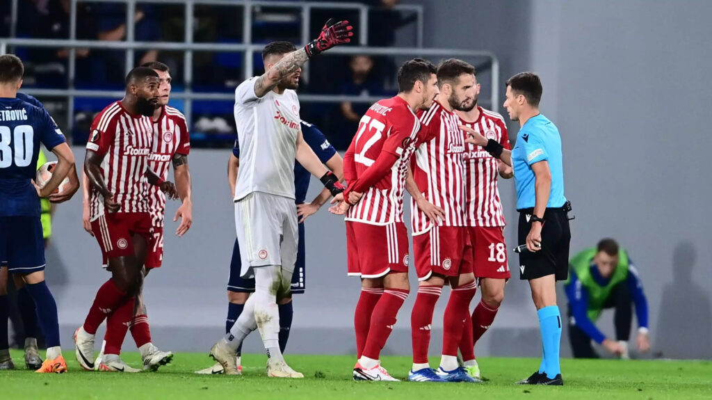 Οι Πειραιώτες θεωρούν πως ο διαιτητής παρέβλεψε να δώσει κάρτα σε εκτός φάσης μαρκαρίσματα σε Φορτούνη και Ρόντινεϊ, ενώ διαφωνούν με την κόκκινη κάρτα στον Ντόη.