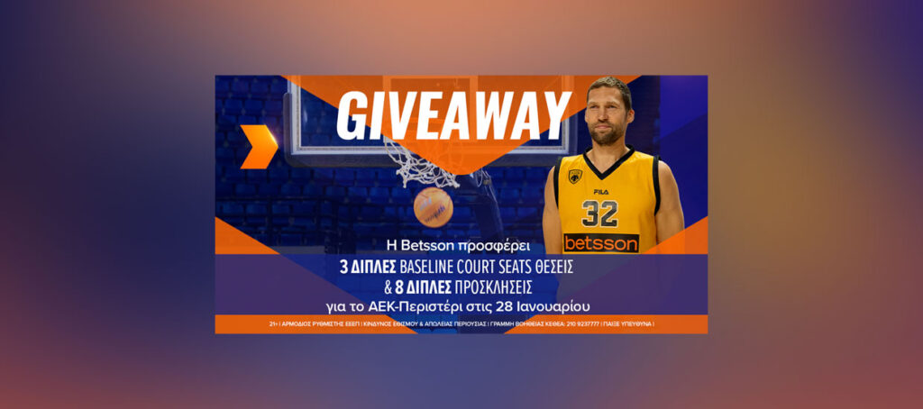 H Betsson ως Μεγάλος Χορηγός της ΑΕΚ BC, προσφέρει 3 Διπλές Baseline Court Seats Θέσεις & 8 Διπλές προσκλήσεις για το ΑΕΚ-Περιστέρι στις 28 Ιανουαρίου για το ελληνικό πρωτάθλημα.