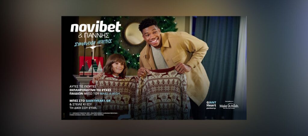 Αθήνα, 21 Δεκεμβρίου 2022 – Η αντίστροφη μέτρηση για τις φετινές γιορτές έχει ήδη ξεκινήσει και όπως κάθε χρόνο, ο ερχομός των Χριστουγέννων είναι συνυφασμένος με πράξεις αγάπης και προσφοράς στους συνανθρώπους μας. Στο ευρύτερο πλαίσιο των δράσεων θετικής κοινωνικής συμβολής της, η Novibet μέσω του προγράμματος “The GiANT Heart” με πρεσβευτή τον Γιάννη Αντετοκούνμπο, προχωράει φέτος τα Χριστούγεννα σε μια Συμμαχία Αγάπης με τον οργανισμό Make-A-Wish (Κάνε-Μια-Ευχή) Ελλάδος, συμβάλλοντας στην εκπλήρωση 6 ευχών παιδιών με σοβαρές ασθένειες.
