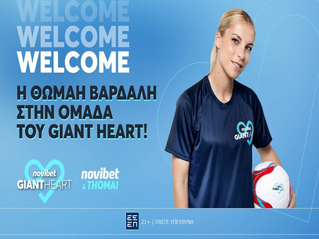 Η κορυφαία διεθνής ποδοσφαιρίστρια Θωμαή Βαρδαλή είναι η νέα προσθήκη στην ομάδα των μεγάλων ονομάτων του ελληνικού ποδοσφαίρου που αποτελούν τους Πρεσβευτές του προγράμματος κοινωνικής προσφοράς Giant Heart της Novibet, μετά τον Κώστα Τσιμίκα και τον Γιάννη Κωνσταντέλια.