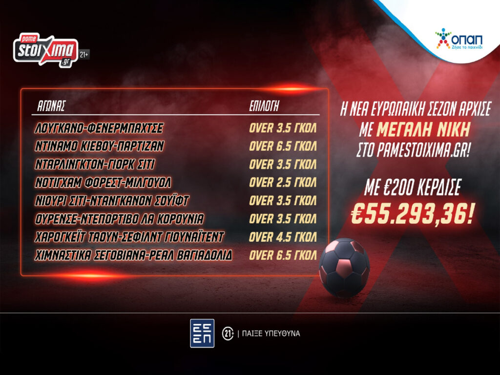Η νέα ευρωπαϊκή σεζόν άρχισε δυναμικά στο Pamestoixima.gr, με ένα μεγάλο τυχερό να κερδίζει €55.293,36!