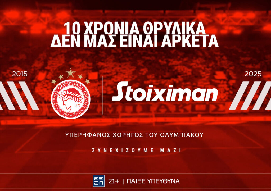 Η Stoiximan, η κορυφαία εταιρεία online gaming και αθλητικού στοιχήματος στην Ελλάδα και στην Κύπρο, ανακοινώνει με υπερηφάνεια μέσα από ένα επετειακό βίντεο την ανανέωση της συνεργασίας της με την ΠΑΕ Ολυμπιακός, επεκτείνοντας τον ρόλο της ως Μεγάλου Χορηγού της ομάδας έως και το 2028.