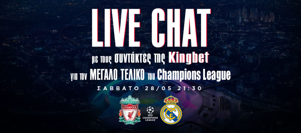 Λίγο πριν ξεκινήσει το μεγάλο ποδοσφαιρικό ραντεβού της Λίβερπουλ με τη Ρεάλ Μαδρίτης στο Σταντ ντε Φρανς του Παρισιού, δηλαδή στις 21:30, οι Νίκος Τσούκας, Πάνος Γαρίδης, Μάκης Μηνδρινός, Δημήτρης Λιαργκόβας, Άγγελος Αναστασόπουλος, Louis Campora, Κωνσταντίνος Ταγαράς και Θάνος Καλόγηρος θα δώσουν δυναμικό «παρών» στο live chat της Kingbet.