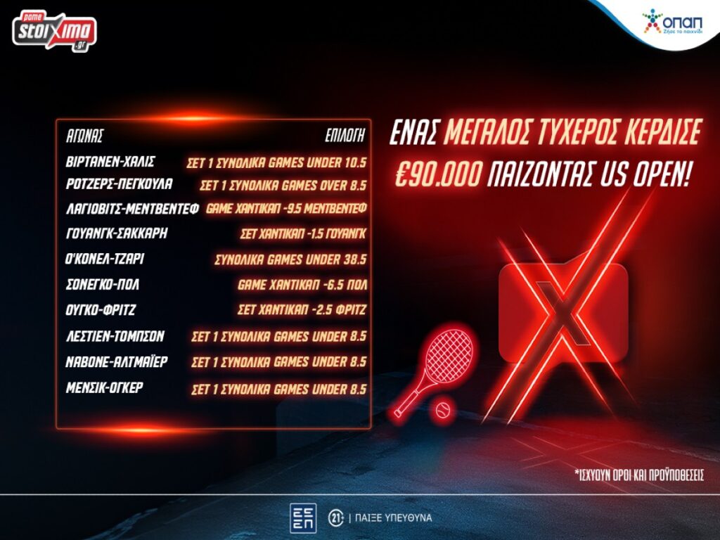 Ένα μεγάλο τυχερό ανέδειξε το Pamestoixima.gr, καθώς κέρδισε €90.000 κάνοντας 10 επιλογές στο US OPEN!
