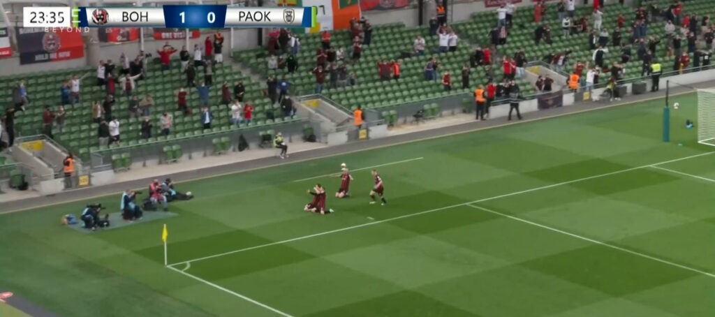 Η Μποέμιανς άνοιξε το σκορ στο Δουβλίνο κόντρα στον ΠΑΟΚ, καθώς στο 24ο λεπτό η άμυνα του “Δικεφάλου του Βορρά” έμεινε ακάλυπτη, με τους γηπεδούχους να εκμεταλλεύονται την αδράνεια και τα κενά των φιλοξενούμενων κάνοντας το 1-0.