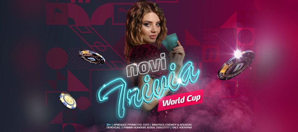 Το Novi Trivia Show είναι ένα ζωντανό παιχνίδι που εκπέμπεται από το live καζίνο, σε επιλεγμένες ημερομηνίες! Κατά τη διάρκεια του Μουντιάλ η εκπομπή θα ξεκινάει στις 23:30 καθημερινά και «7 στα 7».Το παιχνίδι δεν βασίζεται στην τύχη και δεν προϋποθέτει συμμετοχή στα παίγνια με αληθινά χρήματα.