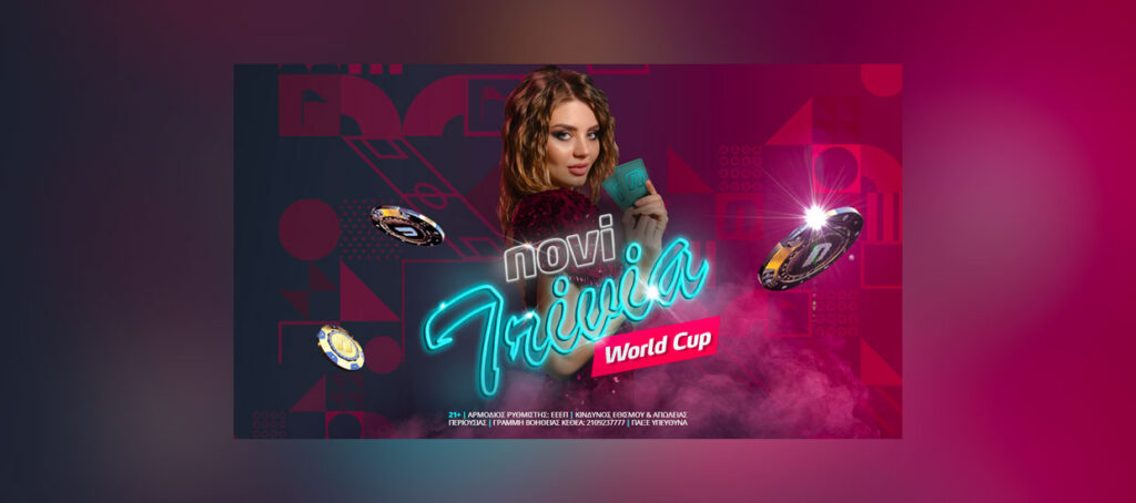 Το Novi Trivia Show είναι ένα ζωντανό παιχνίδι που εκπέμπεται από το live καζίνο, σε επιλεγμένες ημερομηνίες! Κατά τη διάρκεια του Μουντιάλ η εκπομπή θα ξεκινάει στις 23:30 καθημερινά και «7 στα 7».Το παιχνίδι δεν βασίζεται στην τύχη και δεν προϋποθέτει συμμετοχή στα παίγνια με αληθινά χρήματα.