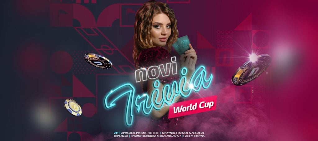 Το Novi Trivia Show είναι ένα ζωντανό παιχνίδι που εκπέμπεται από το live καζίνο, σε επιλεγμένες ημερομηνίες! Κατά τη διάρκεια του Μουντιάλ η εκπομπή θα ξεκινάει στις 23:30 καθημερινά και «7 στα 7».Το παιχνίδι δεν βασίζεται στην τύχη και δεν προϋποθέτει συμμετοχή στα παίγνια με αληθινά χρήματα.