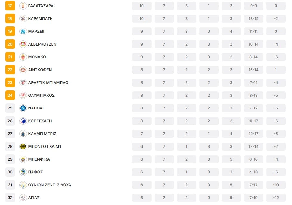 Αυτό που πρέπει να γνωρίζετε για αρχή είναι οι ομάδες που την ακολουθούν στη βαθμολογία τσάμπιονς λιγκ. Αυτή τη στιγμή συναντάμε τον Ολυμπιακό στην 24η θέση της League Phase με οκτώ πόντους και τον ακολουθούν οκτώ ομάδες.