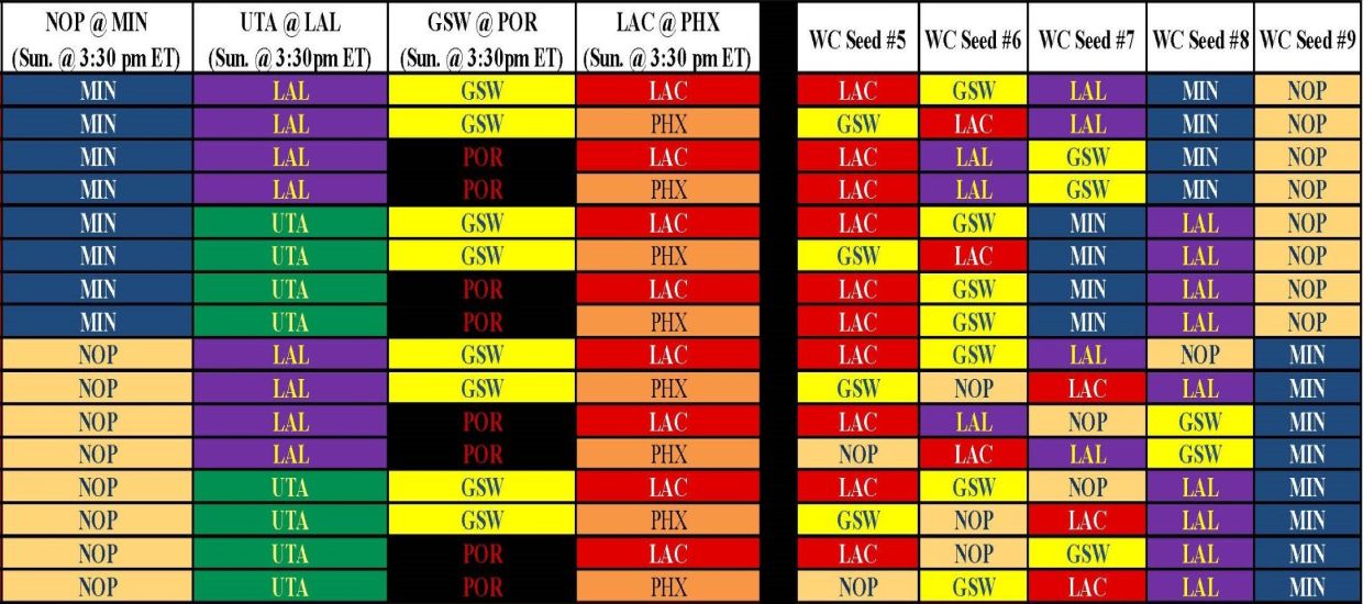 Υπάρχει βέβαια και ένα (τραβηγμένο) σενάριο όπου αν κερδίσουν εκτός από τους ίδιους Πέλικανς, Γουόριορς και Σανς πέφτουν 8οι λόγω τριπλής ισοβαθμίας με την κατάταξη να διαμορφώνεται ως εξής: 5) Γουόριορς, 6) Πέλικανς, 7) Κλίπερς, 8) Λέικερς. Στην 8η θέση πέφτουν προφανώς και αν ηττηθούν ανεξαρτήτως των άλλων αποτελεσμάτων.