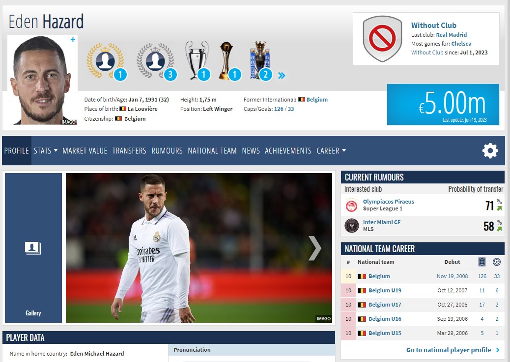 Το σάιτ παρουσιάζει τους Πειραιώτες ως τους βασικούς υποψήφιους για να αποκτήσουν τον πρώην αρχηγό της Εθνικής Βελγίου, o οποίος έμεινε ελεύθερος από τη Ρεάλ Μαδρίτης, έχοντας ως δεύτερη επικρατέστερη την Ίντερ Μαϊάμι του Λιονέλ Μέσι.