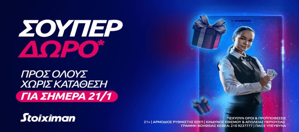 Η εβδομάδα ολοκληρώνεται με τον καλύτερο τρόπο στη Stoiximan. Συγκεκριμένα όλη την Παρασκευή (21/01) είναι διαθέσιμο για όλα τα μέλη της ένα σούπερ δώρο* το οποίο δεν απαιτεί καμία κατάθεση!