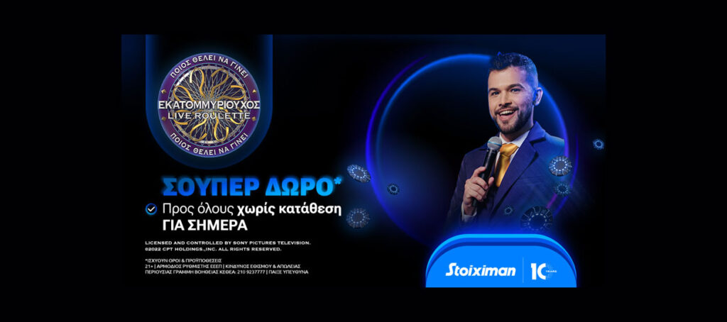 Η εντυπωσιακή ρουλέτα “Ποιος θέλει να γίνει εκατομμυριούχος;” τώρα και με Έλληνες dealers αποκλειστικά* Stoiximan! Και μάλιστα όλη την Κυριακή θα είναι διαθέσιμο ένα δώρο* για όλους χωρίς προϋπόθεση κατάθεσης!