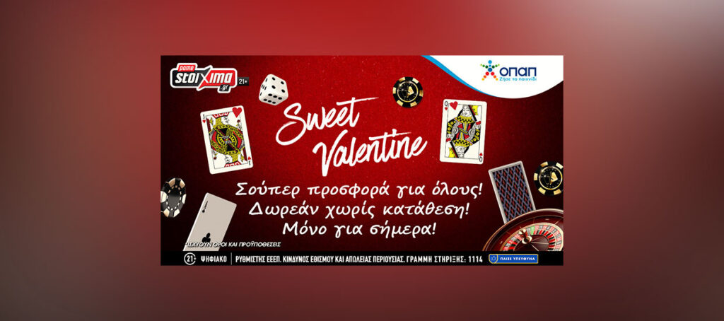 Φτάσαμε στην πιο ερωτική ημέρα του χρόνου, στην ημέρα του Αγίου Βαλεντίνου (14/02) και το Pamestoixima.gr έχει την ανάλογη διάθεση φτιάχνοντας την ημέρα των παικτών του με μια ΦΑΝΤΑΣΤΙΚΗ προσφορά*!