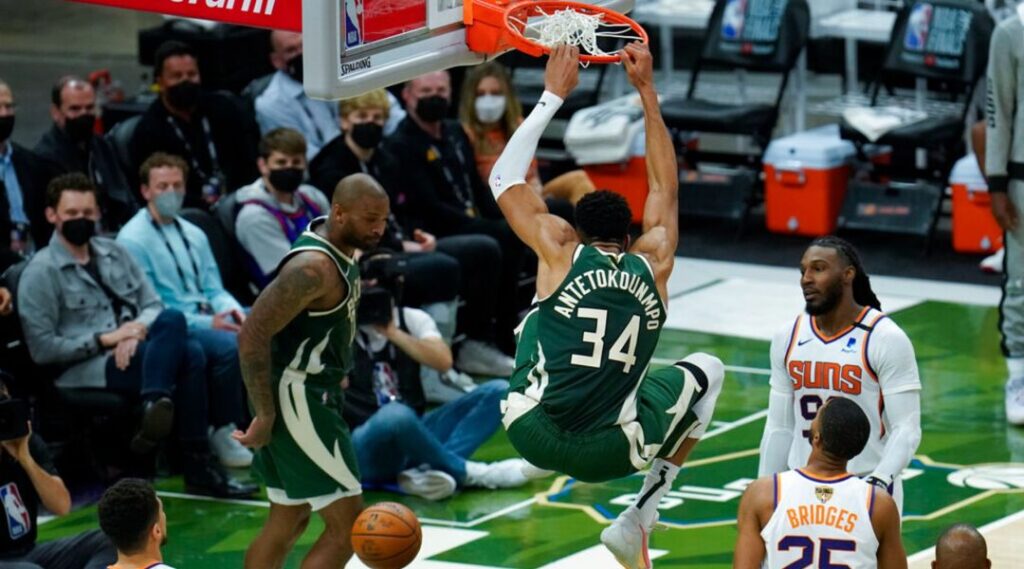 Ο Γιάννης δεν είχε αντίπαλο στην επίθεση, σταμάτησε στους 41 πόντους με 14/23 σουτ, μάζεψε 13 ριμπάουντ, σούταρε με εξαιρετικό ποσοστό από τη γραμμή των βολών, χωρίς να αγχώνεται από την αντίστροφη μέτρηση των αντίπαλων οπαδών για παράβαση χρονικού ορίου και «πλήγωνε» συνεχώς από το «ζωγραφιστό» τους Σανς.