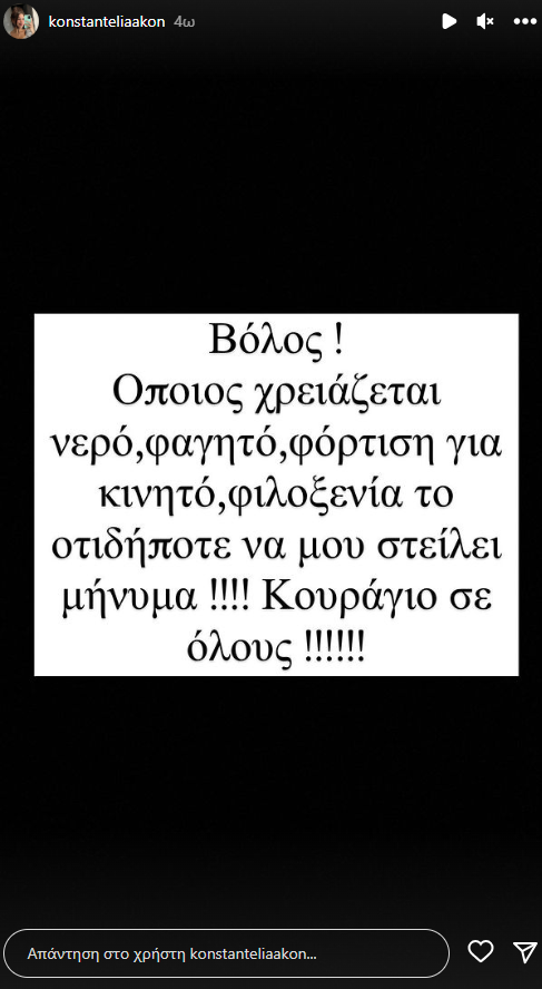 Η κακοκαιρία Ντάνιελ έπληξε σημαντικά τη Θεσσαλία. Η Καρδίτσα και ο Βόλος, ιδιαίτερα, έζησαν πολύ δύσκολες στιγμές και oι πληγέντες βασίζονται στην αλληλεγγύη των συντοπιτών τους. Η Κωνσταντίνα Κωνσταντέλια, αδερφή του παίκτη του ΠΑΟΚ, ενημέρωσε μέσω Instagram πως η ίδια και η οικογένειά της θα βοηθήσουν όποιον έχει ανάγκη φαγητό ή φιλοξενία. Επίσης κοινοποίησε το τηλέφωνο πλοιοκτήτη που μεταφέρει εγκλωβισμένους από τον Πλατανιά Πηλίου.