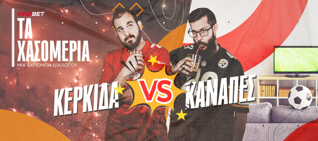 Τύμπανο ή σεμεδάκι; Πυρσός ή τηλεκοντρόλ; Δηλαδή, εξέδρα ή καναπές; Ο Άγγελος Αναστασόπουλος και ο Κωνσταντίνος Ταγαράς προσπαθούν να αποφασίσουν αν το ποδόσφαιρο βλέπεται καλύτερα από το σαλόνι ή από τις κερκίδες του γηπέδου.