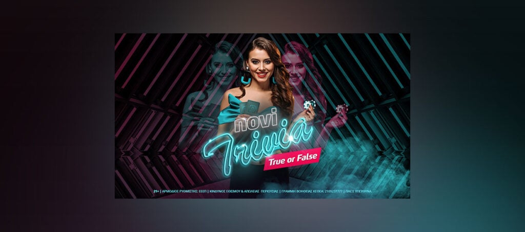 Το συναρπαστικό παιχνίδι ερωτήσεων «Novi Trivia Show» με την αποκλειστική υπογραφή της Novibet γίνεται «True or False» και έρχεται γεμάτο με πλούσια έπαθλα και δώρα*! Το Novi Trivia Show είναι ένα ζωντανό παιχνίδι που εκπέμπεται από το live καζίνο, σε επιλεγμένες ημερομηνίες!