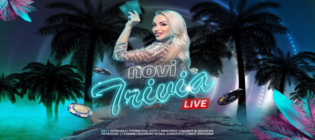 Το Novi Trivia Show είναι ένα ζωντανό παιχνίδι που εκπέμπεται από το live καζίνο, σε επιλεγμένες ημερομηνίες κάθε μήνα. Αυτή την εβδομάδα, δύο φανταστικές εκπομπές θα γεμίσουν το απόγευμα του Σαββάτου και της Κυριακής με καλοκαιρινή διάθεση στις 19:00.