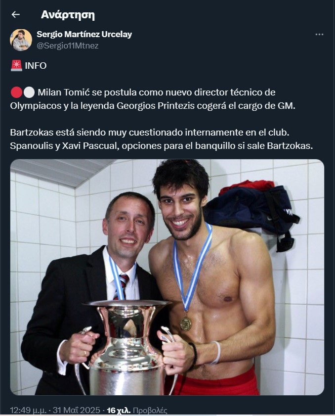 «Ο Μίλαν Τόμιτς ορίστηκε νέος τεχνικός διευθυντής του Ολυμπιακού και ο θρυλικός Γεώργιος Πρίντεζης αναλαμβάνει γενικός διευθυντής. Ο Μπαρτζώκας αμφισβητείται έντονα εσωτερικά στον σύλλογο. Οι Σπανούλης και Τσάβι Πασκουάλ είναι επιλογές για τον πάγκο σε περίπτωση που φύγει ο Μπαρτζώκας»