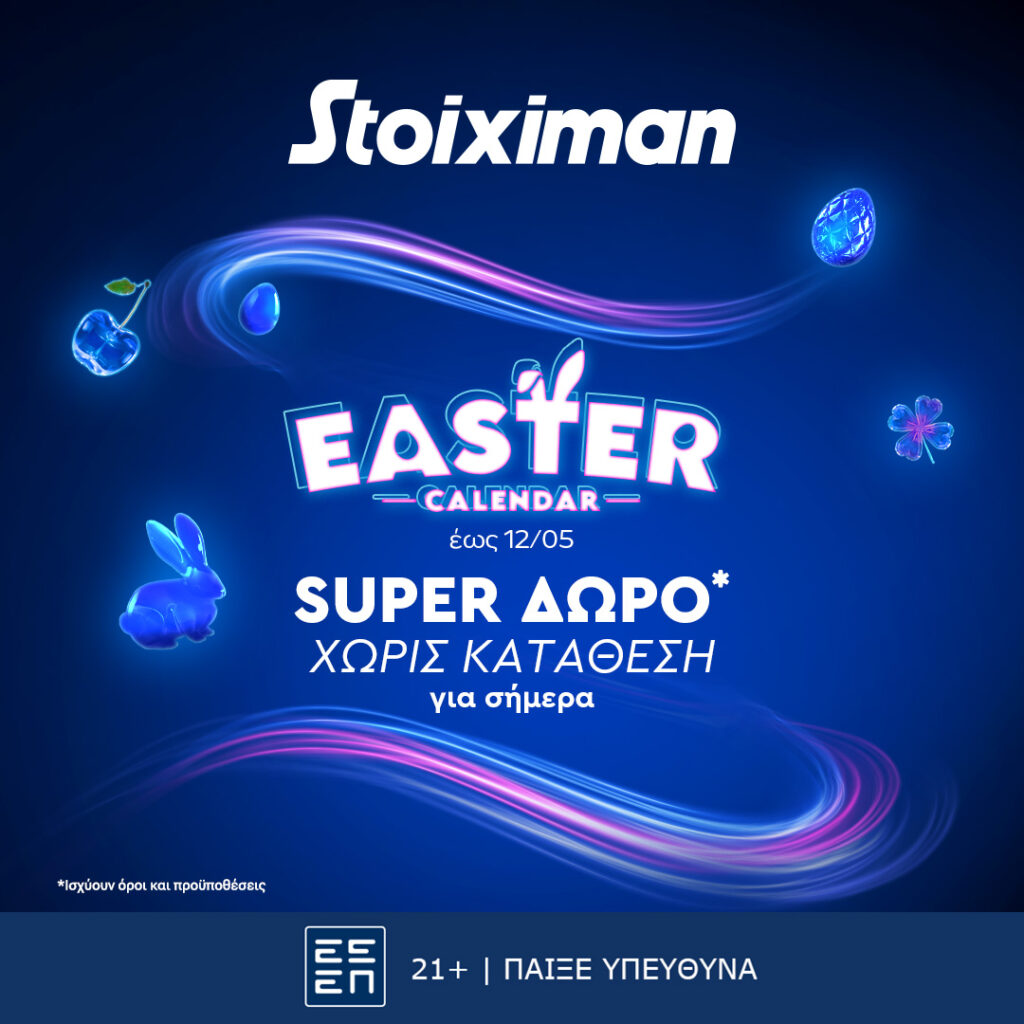Δευτέρα του Πάσχα σήμερα και τα δώρα* συνεχίζονται στη Stoiximan. Μαζί, σε περιμένει μια υπέροχη προσφορά γνωριμίας, χωρίς κατάθεση* αλλά κι ένα νέο τουρνουά Live Casino με μεγάλη ανταμοιβή*.