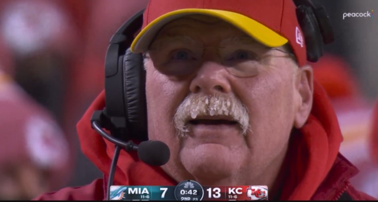 Αλλά δεν είναι αυτό το θέμα μας. Το θέμα είναι το παιχνίδι με τους Στίλερς. Ένα ματς που έπρεπε να γίνει χθες, όμως αναβλήθηκε. Όχι λόγω του κρύου. Αυτό δεν πειράζει κανέναν. Το Κάνσας Σίτι, μία μέρα νωρίτερα, έπαιξε με το Μαϊάμι στους -20 βαθμούς. To μουστάκι του κόουτς Ριντ πάγωσε. Αλλά το ματς έγινε κανονικά.