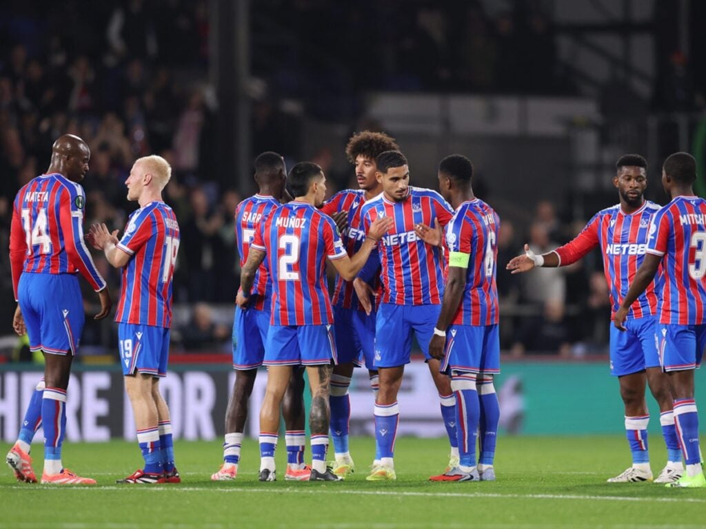 LONDON, ENGLAND - NOVEMBER 06: Maxence Lacroix of Crystal Palace celebrates with teammates after scoring his team's first goal having been awarded following a VAR review during the UEFA Conference League 2025/26 League Phase MD3 match between Crystal Palace FC and AZ Alkmaar at Selhurst Park on November 06, 2025 in London, England. (Photo by Ryan Pierse/Getty Images)