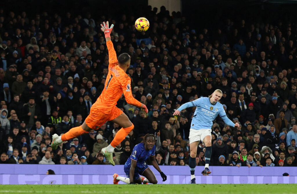 Soccer Football - Premier League - Manchester City v Chelsea - Etihad Stadium, Manchester, Britain - January 25, 2025 Manchester City's Erling Haaland scores their second goal past Chelsea's Robert Sanchez Action Images via Reuters/Lee Smith EDITORIAL USE ONLY. NO USE WITH UNAUTHORIZED AUDIO, VIDEO, DATA, FIXTURE LISTS, CLUB/LEAGUE LOGOS OR 'LIVE' SERVICES. ONLINE IN-MATCH USE LIMITED TO 120 IMAGES, NO VIDEO EMULATION. NO USE IN BETTING, GAMES OR SINGLE CLUB/LEAGUE/PLAYER PUBLICATIONS. PLEASE CONTACT YOUR ACCOUNT REPRESENTATIVE FOR FURTHER DETAILS..