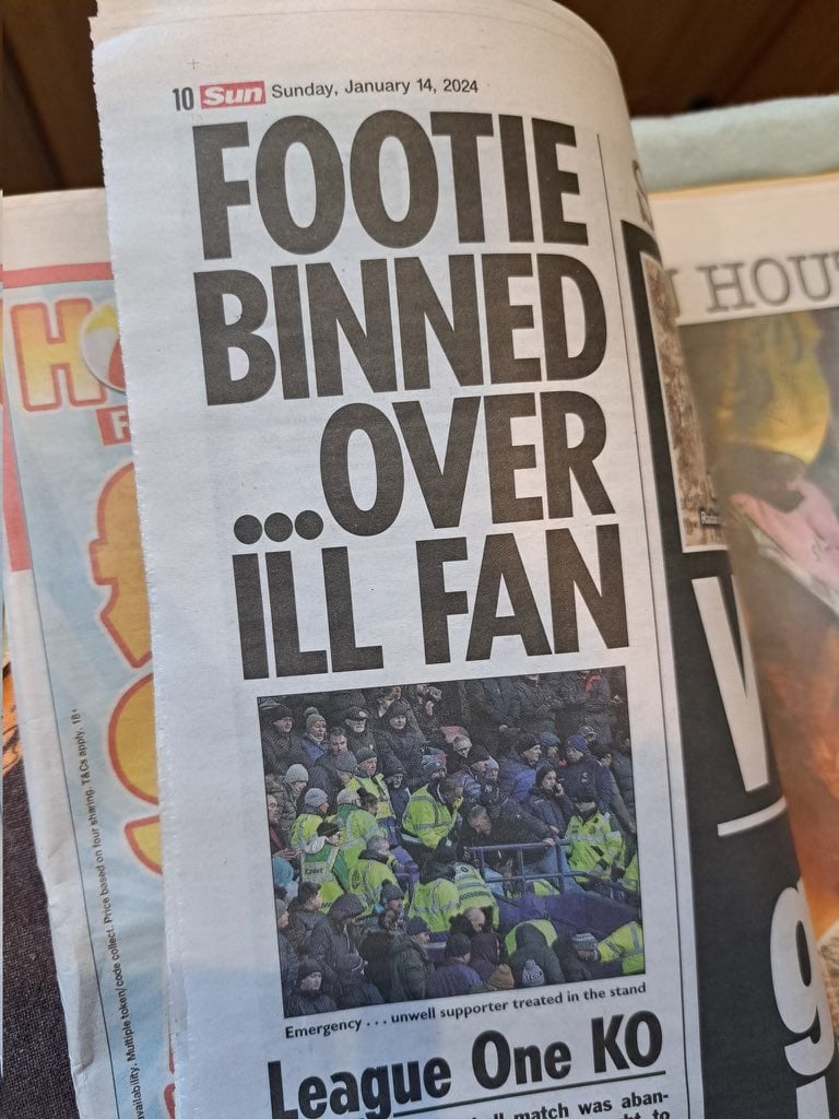 Είναι από τις στιγμές που αδιαμφισβήτητα ο χρόνος παγώνει και δεν υπάρχει όρεξη για ποδόσφαιρο. Ο διαιτητής, δίκαια, αποφάσισε τη διακοπή του παιχνιδιού, το οποίο πρόκειται να οριστεί σε άλλη ημερομηνία. Η αγγλική εφημερίδα «The Sun» ωστόσο, για ακόμα μία φορά απέδειξε ότι κάνει μόνο για… προσάναμμα. «Αγώνας ποδοσφαίρου στα σκουπίδια, εξαιτίας ενός αδιάθετου οπαδού», ανέφερε σχετικά με το συμβάν.