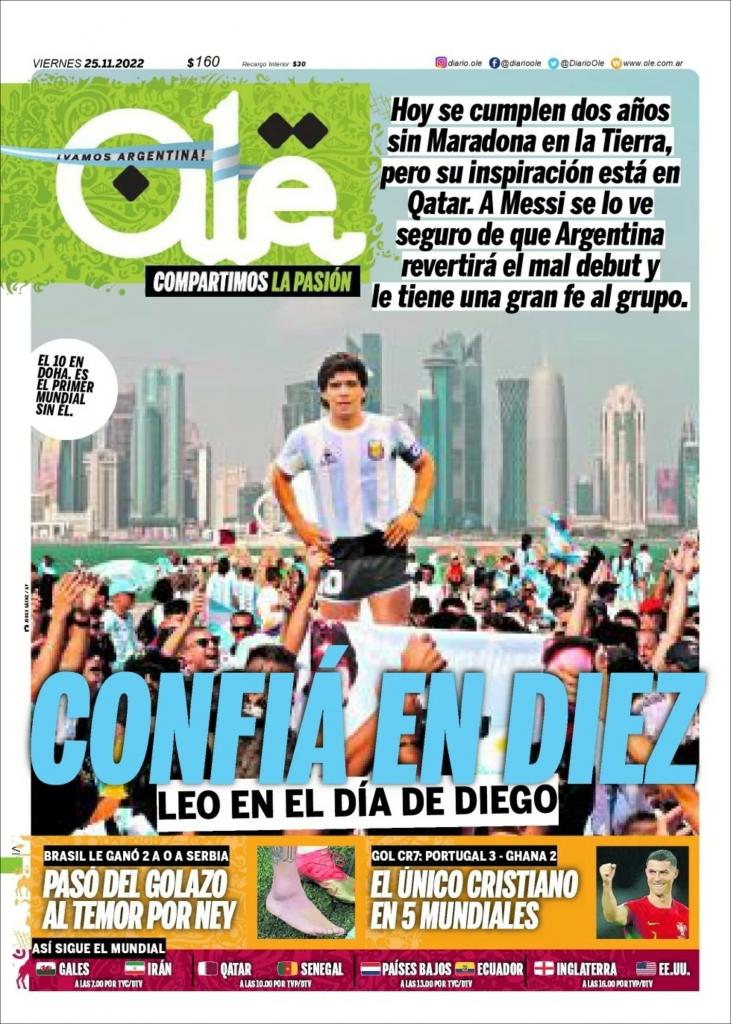 Η Αργεντινή υπέστη το κάζο της διοργάνωσης μέχρι τώρα και θα είναι υποψιασμένη. Πίστη υπάρχει στη χώρα, στον Τύπο και στους οπαδούς. Ευτυχώς η «γκέλα» ήρθε νωρίς και δεν έχει χαθεί τίποτα. Αν είναι σοβαρή αυτή η Αργεντινή, μπορεί να κάνει δύο νίκες και να περάσει. Το θέμα είναι να έχει σε καλύτερη μέρα τα ατού της και ο Σκαλόνι να μην… κοιμηθεί πάλι στον πάγκο. Σαν χθες πριν από δύο χρόνια πέθανε ο Ντιέγκο Μαραντόνα. Σήμερα η αγαπημένη του Εθνική Αργεντινής βρίσκεται σε μια δύσκολη φάση. Όπως έγραψε και η Ole, «Εμπιστεύσου το 10», εξηγώντας πως η αύρα του Ντιέγκο θα βρίσκεται στο Κατάρ και πως με πίστη ο Μέσι μπορεί να οδηγήσει την ομάδα του στη νίκη.