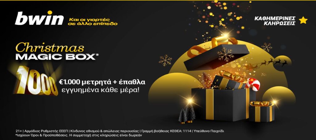 Στην bwin, αυτά τα Χριστούγεννα σε περιμένουν €1.000 μετρητά, εγγυημένα, κάθε μέρα έως τις 9 Ιανουαρίου, φτάνει να ανοίξεις το δικό σου Christmas Magic Box*.
