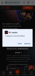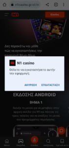 1) Ανοίξτε τον browser του κινητού σας και πληκτρολογήστε Ν1Casino.gr. Στην οθόνη σας θα εμφανιστεί το μήνυμα “Εγκατάσταση Εφαρμογής Ν1” και εσείς θα πρέπει να πατήσετε πάνω στο κουμπί Εγκατάσταση”.