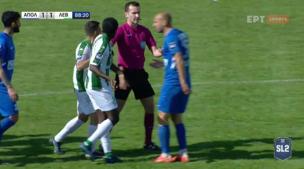 Στο 89ο λεπτό της αναμέτρησης Απόλλων Λάρισας – Λεβαδειακός, οι γηπεδούχοι ισοφάρισαν με εύστοχη εκτέλεση πέναλτι. Θέλοντας και οι δύο ομάδες να ψάξουν τη νίκη στα εναπομείναντα λεπτά, παίκτες και από τις δύο πλευρές έτρεξαν να μαζέψουν την μπάλα από τα δίχτυα, προκειμένου να βιαστούν, πέτυχαν όμως το αντίθετο, αφού βρέθηκαν να μαλώνουν σαν τα κοκόρια, αναγκάζοντας το διαιτητή να μοιράσει κίτρινες κάρτες!