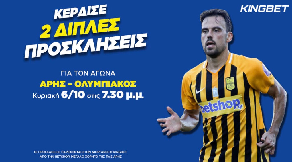 Ακόμη ένας μεγάλος διαγωνισμός της Kingbet! Τέσσερις τυχεροί φίλαθλοι θα έχουν τη δυνατότητα να παρακολουθήσουν από κοντά και δωρεάν την αναμέτρηση Αρης – Ολυμπιακός, την Κυριακή 6 Οκτωβρίου στις 19:30!