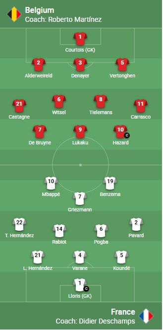 Γαλλία (3-4-1-2): Γιορίς – Κουντέ, Βαράν, Λ. Ερνάντεζ – Παβάρ, Πογκμπά, Ραμπιό, Τ. Ερνάντεζ – Γκριεζμάν – Μπενζεμά, Μπαπέ.