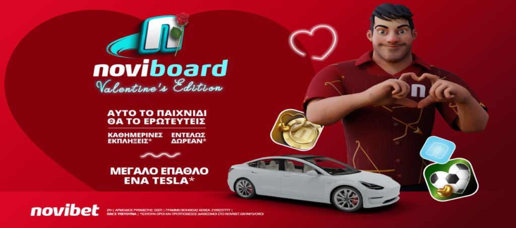 Το ήδη επιτυχημένο Noviboard* συνεχίζεται τον Φεβρουάριο γεμάτο εκπλήξεις* και πιο θεματικό από ποτέ. Να σημειωθεί ότι στο συναρπαστικό παιχνίδι της Novibet, ακόμα ένας τυχερός θα κερδίσει ένα TESLA Model 3, στην κλήρωση που θα πραγματοποιηθεί στις 7 Μαρτίου 2022!