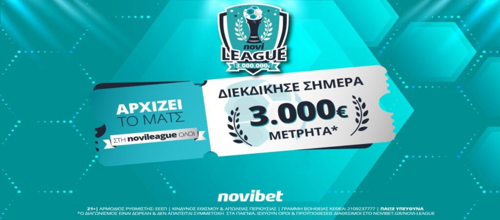 *Ο ΔΙΑΓΩΝΙΣΜΟΣ ΕΙΝΑΙ ΔΩΡΕΑΝ & ΔΕΝ ΑΠΑΙΤΕΙΤΑΙ ΣΥΜΜΕΤΟΧΗ ΣΤΑ ΠΑΙΓΝΙΑ. ΙΣΧΥΟΥΝ ΟΡΟΙ & ΠΡΟΫΠΟΘΕΣΕΙΣ ΔΙΑΘΕΣΙΜΟΙ ΣΤΟ NOVIBET.GR/NOVI-LEAGUE
