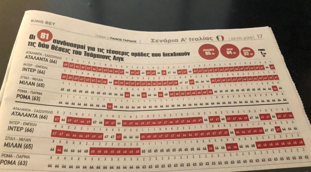 Καταρχάς να εξηγήσω τι βλέπετε στη φωτογραφία. Είναι ο πίνακας με τους 81 διαφορετικούς συνδυασμούς αποτελεσμάτων που μπορούν να προκύψουν από τα σημερινά παιχνίδια των τεσσάρων ομάδων στην Α Ιταλίας (Αταλάντα, Ιντερ, Μίλαν, Ρόμα) που διεκδικούν τις δύο τελευταίες θέσεις για το Τσάμπιονς Λιγκ.