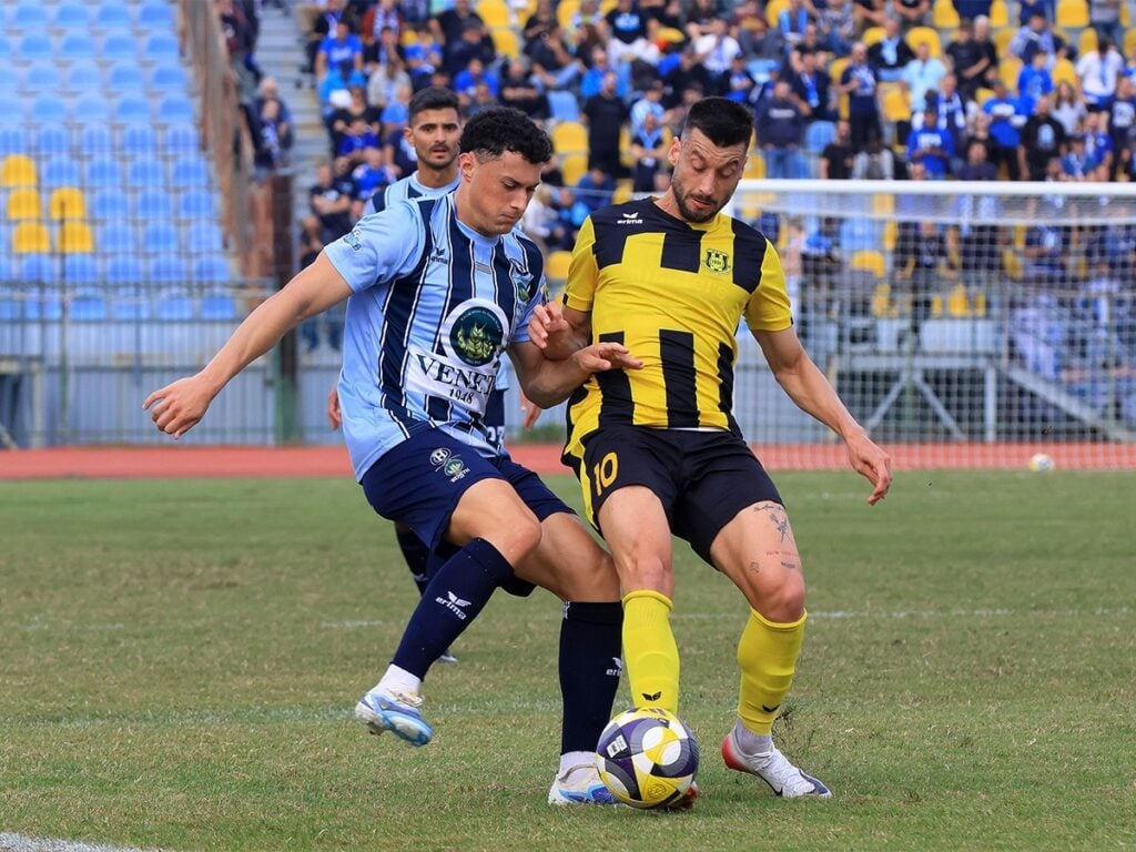 Το πρώτο ημίχρονο του ντέρμπι είχε ένταση, δυνατές μονομαχίες και σκληρά μαρκαρίσματα, με την κατοχή να είναι αρκετά μοιρασμένη. Στο 23′, ο Γηραιός πήρε προβάδισμα με εντυπωσιακό ανάποδο ψαλίδι του Μάναλη, ο οποίος σημείωσε το 9ο φετινό του γκολ. Το προβάδισμα της ομάδας του Γιώργου Πετράκη, ωστόσο, κράτησε μόλις δέκα λεπτά, καθώς στο 33′ ο Τζανετόπουλος ισοφάρισε με δυνατή καρφωτή κεφαλιά, διαμορφώνοντας το 1-1.